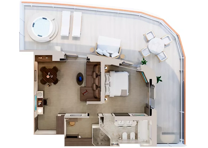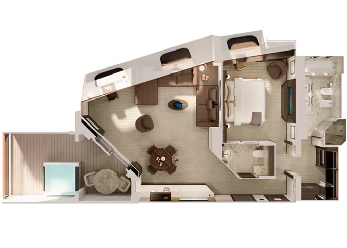 | Retreat Residence Suita 63 m² + Terasa s vírivkou a sedením 14 m² / 7. paluba: 18 m². Spálňa s obývacou a jedálenskou časťou, šatník. Koktailová súprava, minibar, kávovar, vodná kanvica, ďalekohľad, sejf, mramorová kúpeľňa s vaňou a sprchou, extra wc. Taška Technogym Case Kit. Fľaša šampanského na privítanie. Služby osobného majordóma. Maximálna kapacita 3 dospelí alebo 2 dospelí + 2 deti pod 18 rokov. | 29 526 € 9 842 € za osobu | ||