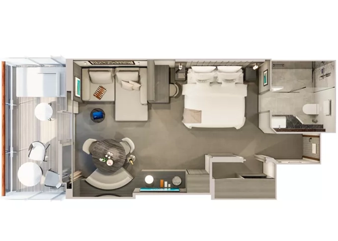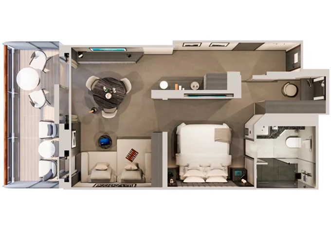 | Retreat Residence Suita 63 m² + Terasa s vírivkou a sedením 14 m² / 7. paluba: 18 m². Spálňa s obývacou a jedálenskou časťou, šatník. Koktailová súprava, minibar, kávovar, vodná kanvica, ďalekohľad, sejf, mramorová kúpeľňa s vaňou a sprchou, extra wc. Taška Technogym Case Kit. Fľaša šampanského na privítanie. Služby osobného majordóma. Maximálna kapacita 3 dospelí alebo 2 dospelí + 2 deti pod 18 rokov. | 23 620 € 23 620 € za osobu | ||
