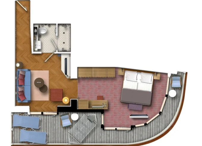 SHZO - Horizont Suite 38-40 m² + balkón 16 m² s ležadlami a hojdacou sieťou. Obývacia časť a oddelená spálňa. 7-8. paluba. Max 4 osoby. Výhody Suite. 24 186 € 8 062 € za osobu