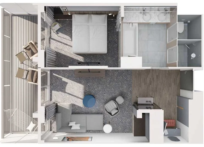 JBAO - Junior Suite s balkónom 26 m² + balkón 7 m² so stoličkami a podnožkami. 9-14. paluba. Max 4 osoby. Výhody Junior Suite. 4 538 € 2 269 € za osobu